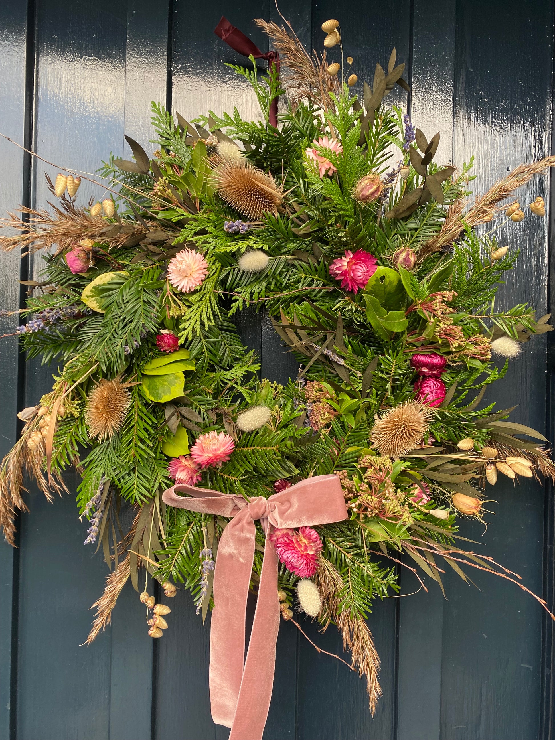 30cm wreaths made, where possible, with locally sourced materials and lovely added Christmassy details, with a velvet ribbon bow to the colour of your choice. No plastic.